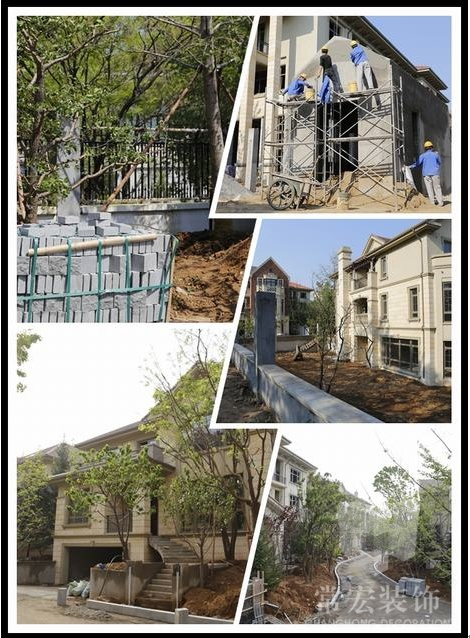 此項目常宏裝飾負責的鐵藝欄桿的安裝、地面的鋪裝、外墻及景觀的施工等。圖片中工人正在進行別墅警衛(wèi)室的施工。