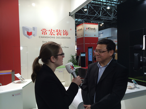 做為中國參展企業(yè)的代表,常宏裝飾總經(jīng)理王躍先生在展位接受了展會(huì)主辦方(杜塞爾多夫展覽公司)的采訪,就歐洲零售業(yè)、中國零售業(yè)和EuroShop等主題闡述了常宏裝飾的觀點(diǎn)和建議。