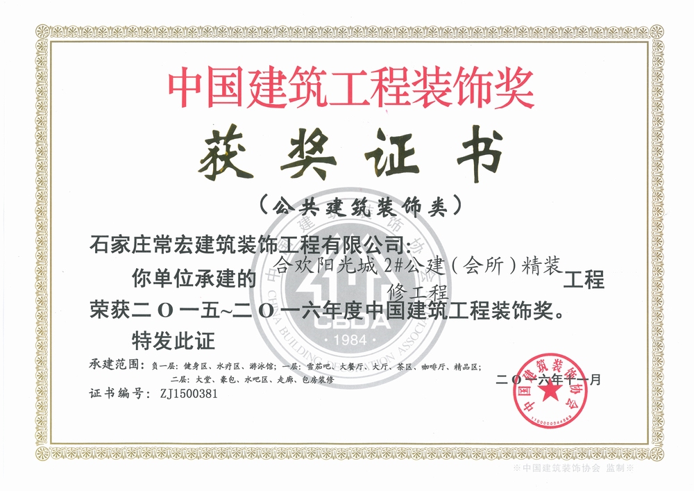 2016年12月23日,2015-2016年度中國建筑工程裝飾獎(jiǎng)?lì)C獎(jiǎng)大會(huì)在北京國家會(huì)議中心召開。會(huì)上,由常宏建筑裝飾工程有限公司承建的合歡陽光城2#公建(會(huì)所)精裝修工程、金地大廈B座內(nèi)裝修工程一標(biāo)段兩項(xiàng)工程,榮獲2015-2016年度中國建筑工程裝飾獎(jiǎng)——公共建筑裝飾類。常宏店裝大區(qū)管理中心總經(jīng)理周增良、品管部安全副總監(jiān)孫文海參加了此次頒獎(jiǎng)大會(huì)。
