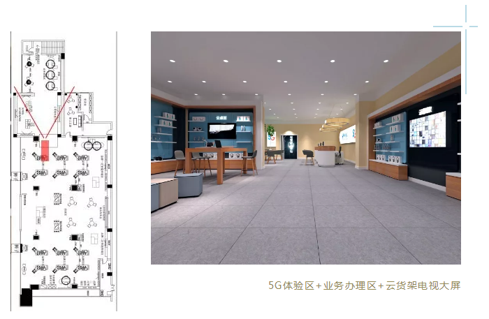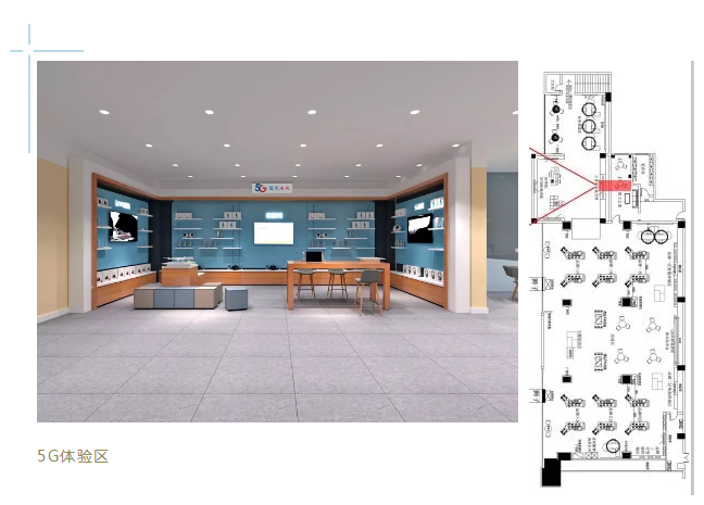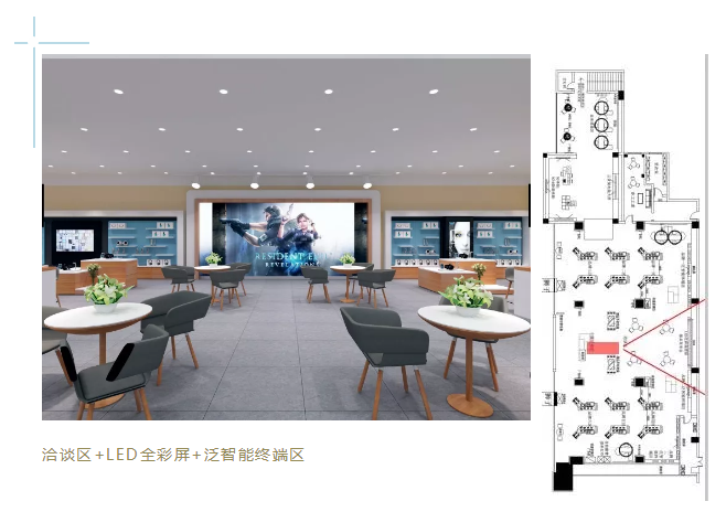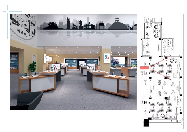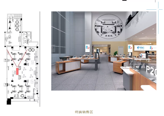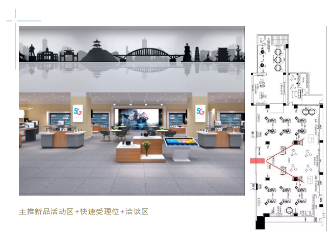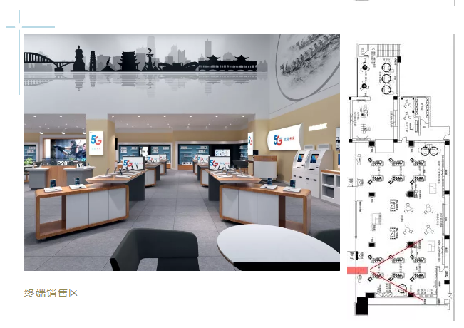 在功能分區(qū)方面,空間采用分區(qū)不區(qū)分的輻射設(shè)計(jì):輻射型分區(qū)覆蓋原有的所有功能,各功能區(qū)無(wú)縫連接。以終端體驗(yàn)為核心,休閑與服務(wù)體驗(yàn)分散于周邊,在終端體驗(yàn)區(qū),實(shí)現(xiàn)終端體驗(yàn)、套餐定制、購(gòu)買、流量定制一體化;在休閑服務(wù)區(qū),實(shí)現(xiàn)驗(yàn)機(jī)、下載、娛樂、休息一體化。