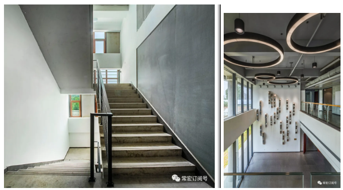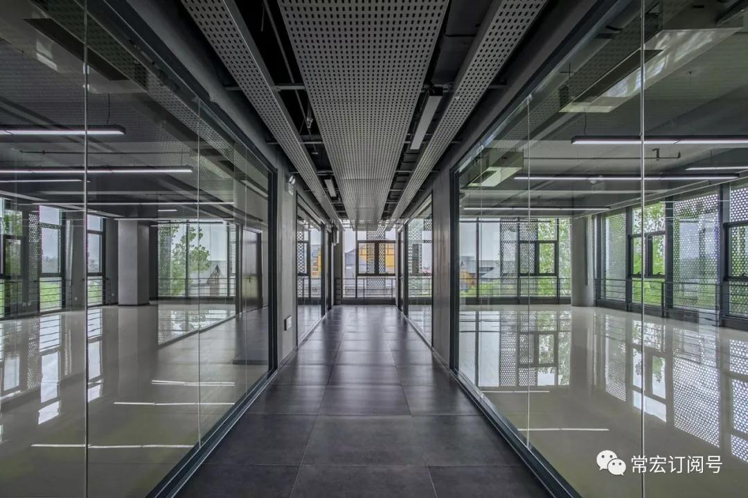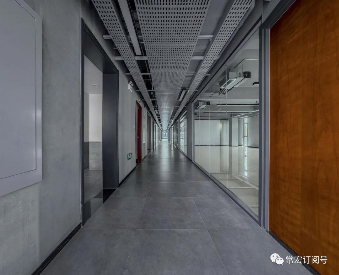 本項目室內(nèi)設(shè)計風(fēng)格延續(xù)了外觀設(shè)計的工業(yè)建筑特點,把清水面的樸素質(zhì)感延伸到室內(nèi)。如室內(nèi)走廊吊頂各種管線的外露,加以穿孔鋁板半遮半掩的裝飾,既強調(diào)了工業(yè)特點,又是對建筑外觀裝飾語言的延續(xù)和呼應(yīng)。整個室內(nèi)的空間設(shè)計與建筑融為一體。