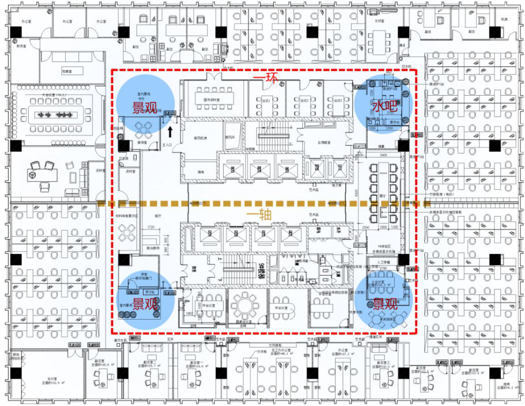 空間動(dòng)線規(guī)劃是辦公空間設(shè)計(jì)的核心,平衡功能需求與原有建筑本體的關(guān)系,進(jìn)而形成一軸、一環(huán)、四節(jié)點(diǎn)的總體布局,來回應(yīng)企業(yè)日常辦公、商務(wù)禮儀的功能需要。