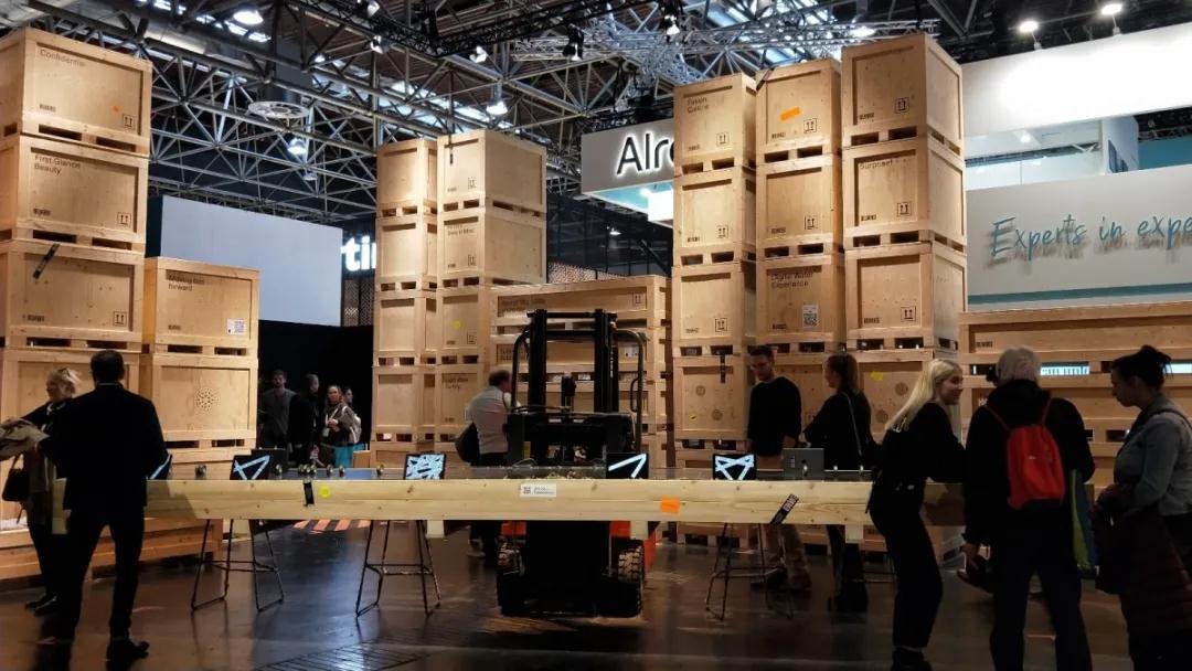 DART的展區(qū)則是用了大量的包裝箱,滿滿工業(yè)風(fēng)。據(jù)說(shuō)每個(gè)箱子上有一個(gè)小孔,從小孔中望去是該公司做的一個(gè)個(gè)鮮活的案例,這也許就是對(duì)設(shè)計(jì)另外一種別致的展現(xiàn)方式。中央有一個(gè)長(zhǎng)約6米的木質(zhì)展臺(tái),干脆沒(méi)有桌腿,是被一臺(tái)叉車(chē)托舉著,挺佩服設(shè)計(jì)師和決策者的想法。