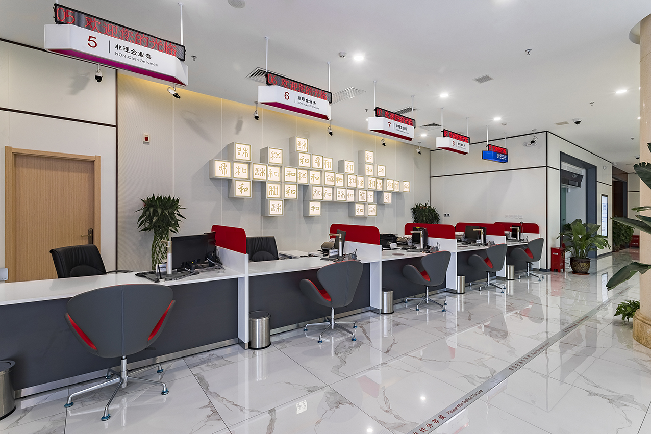 在設(shè)計(jì)上,和平支行以“和”為設(shè)計(jì)主題,將“和”字元素融入到營(yíng)業(yè)廳內(nèi)部空間,打造“網(wǎng)點(diǎn)+文化”的特色營(yíng)業(yè)廳。“和”字蘊(yùn)含了平等共事、和諧共處、多樣共存、合作共贏等普世價(jià)值觀。傳統(tǒng)文化與智能化的結(jié)合,使和平支行充滿了新的生命力,代表了和平支行的工作態(tài)度和對(duì)顧客的服務(wù)態(tài)度。
